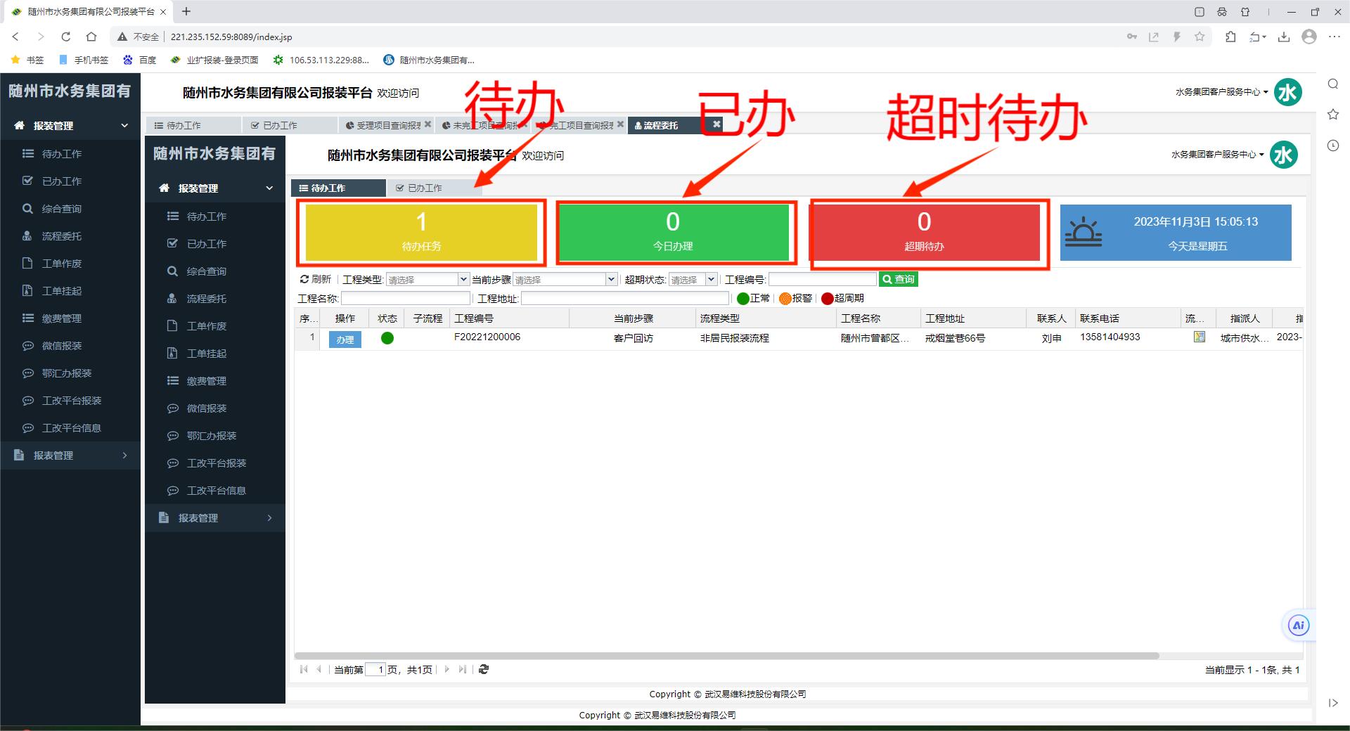 報裝業(yè)務管理系統(tǒng)通過流程監(jiān)測,對“待辦,已辦,超時待辦”的業(yè)務進行分別處理,保證業(yè)務有效流轉(zhuǎn),及時辦結(jié)。