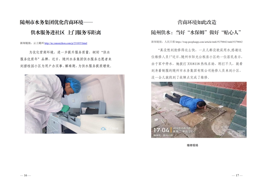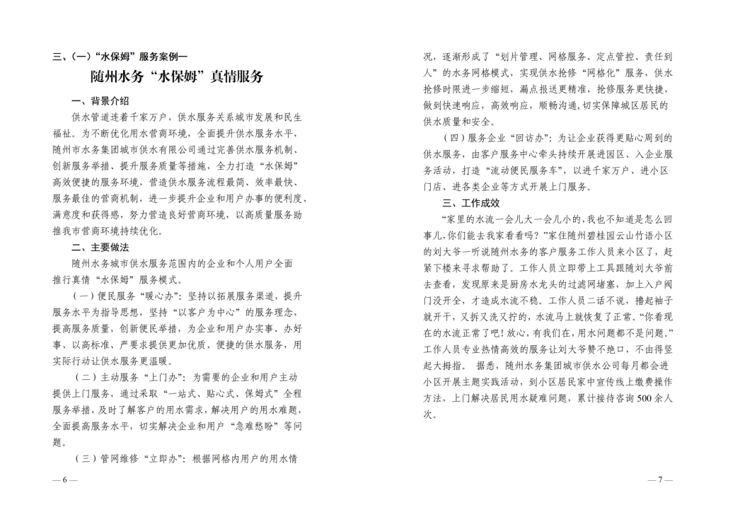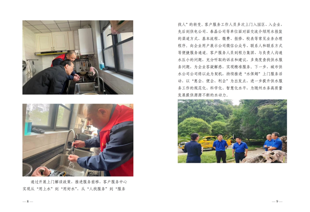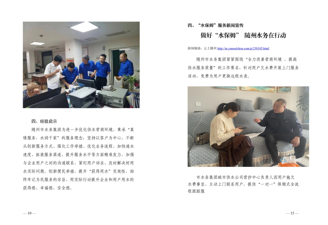 為全面提升供水服務(wù)水平,優(yōu)化供水營(yíng)商環(huán)境,隨州水務(wù)集團(tuán)推出“水保姆”供水服務(wù)新模式,建立“供水服務(wù)網(wǎng)格員”隊(duì)伍,通過(guò)開(kāi)展清表核查、網(wǎng)格劃分、聯(lián)合社區(qū)共同解決用戶(hù)問(wèn)題等亮點(diǎn)行動(dòng),讓百姓暖心,讓企業(yè)放心。